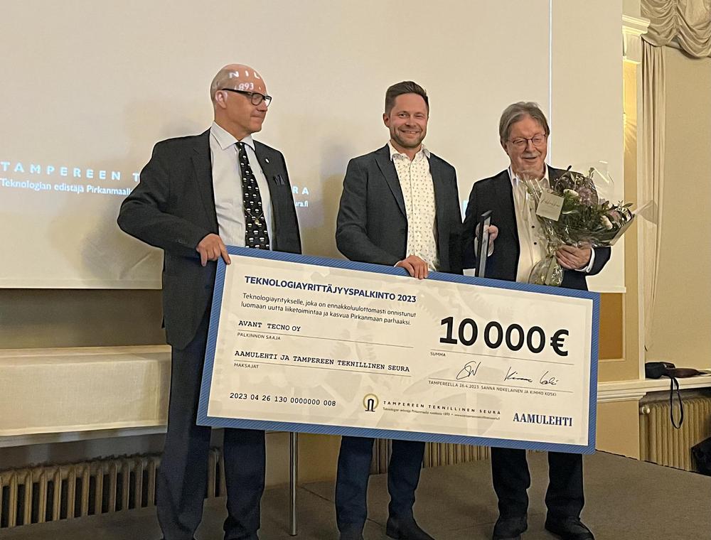 Tampereen Teknillinen Seura onnittelee vuoden 2023 Teknologiayrittäjyyspalkinnon saajaa, Avant Techno Oy! Taustavaikuttajatunnustuksen sai Dimecc oy:n toimitusjohtaja Harri Kulmala.